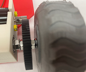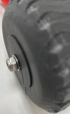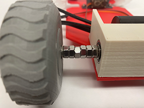- In order to keep the Left Wheel from spinning off the axle while driving, allow the bolt to stick out of the Left Wheel just enough to slide on a washer and screw on a locking nut (see image)!